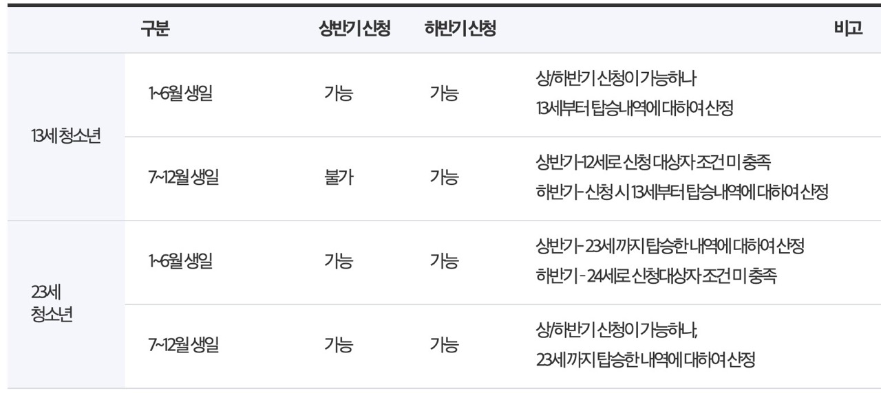 - 10년 08월 15일 생일인 청소년은 상반기에는 신청 불가하고 하반기 (8월 15일~ 12월 31일)에 수령이 가능하다.