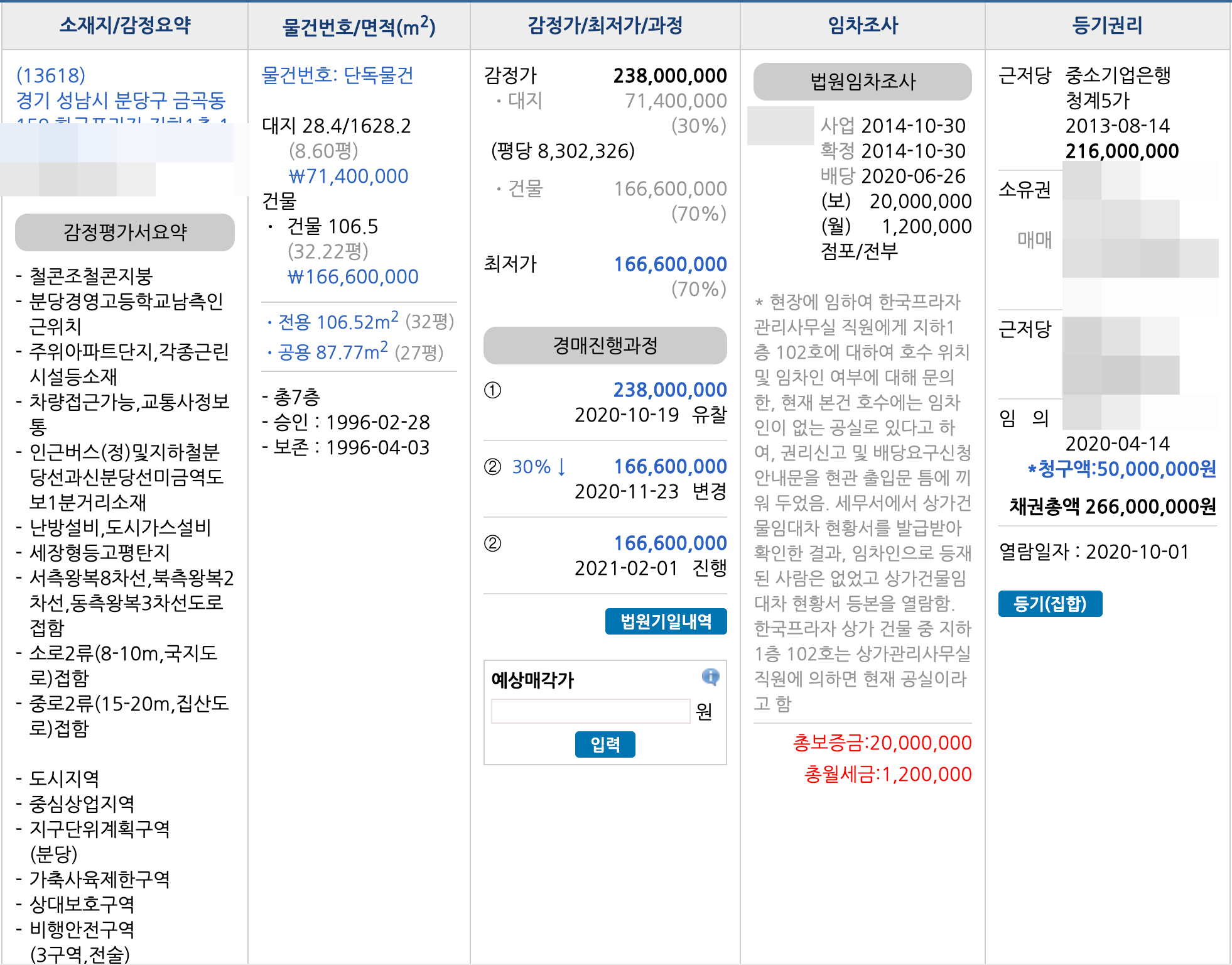 간단하게 권리분석도 한번 해보겠다. 사업을 2014-10-30에 시작하셨지만 근저당인 2013-08-14로 더 빠르기 때문에 임차인의 권리는 없다고 보인다. 하지만 임의 경매를 신청하신 분이 중소기업은행보다 후순위이기 때문에 낙찰 금액이 2.1억 이상 되지 않을 경우 한푼도 돌려받지 못하는 무잉여가 돼서 취소될 것으로 보인다.