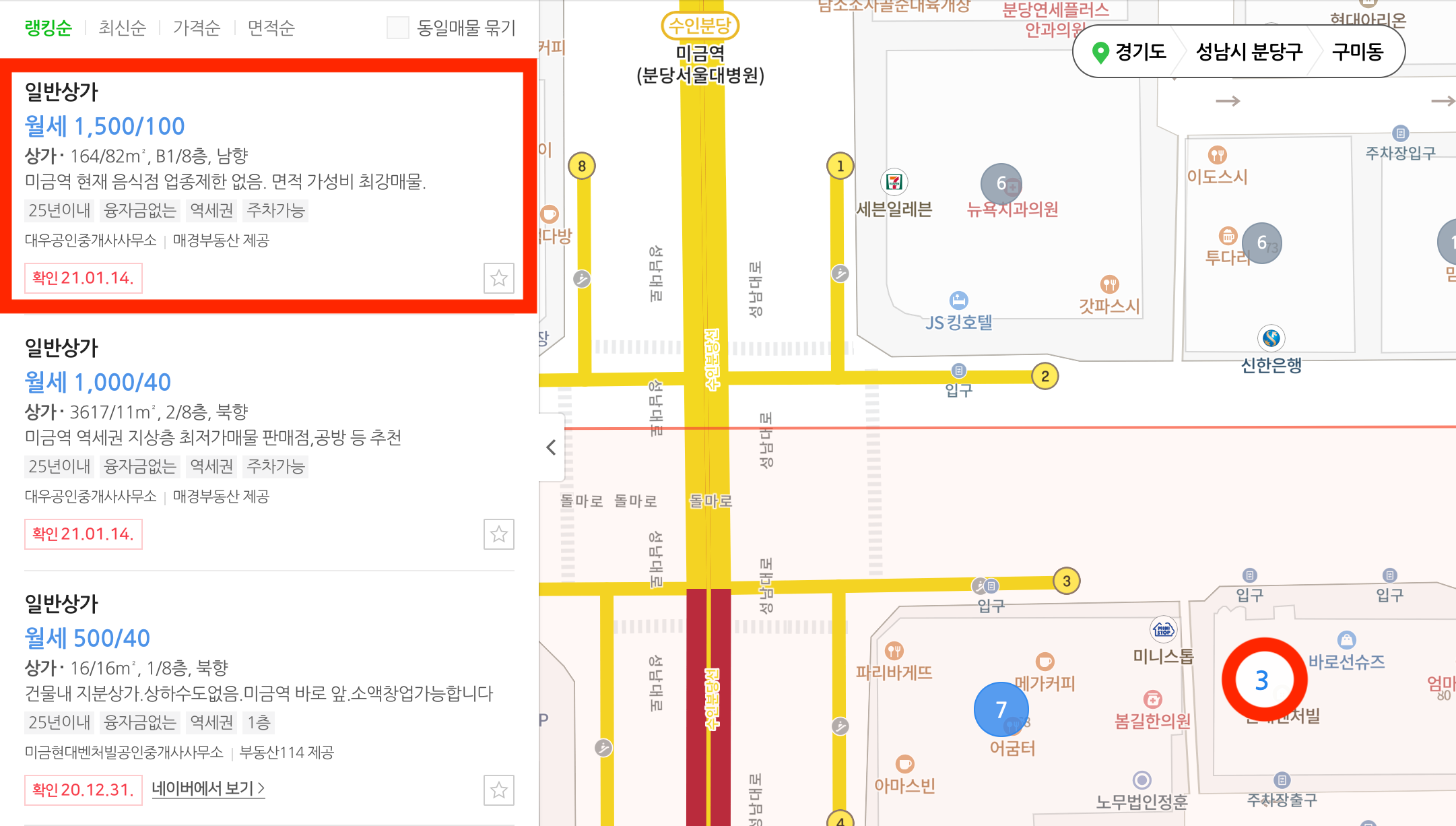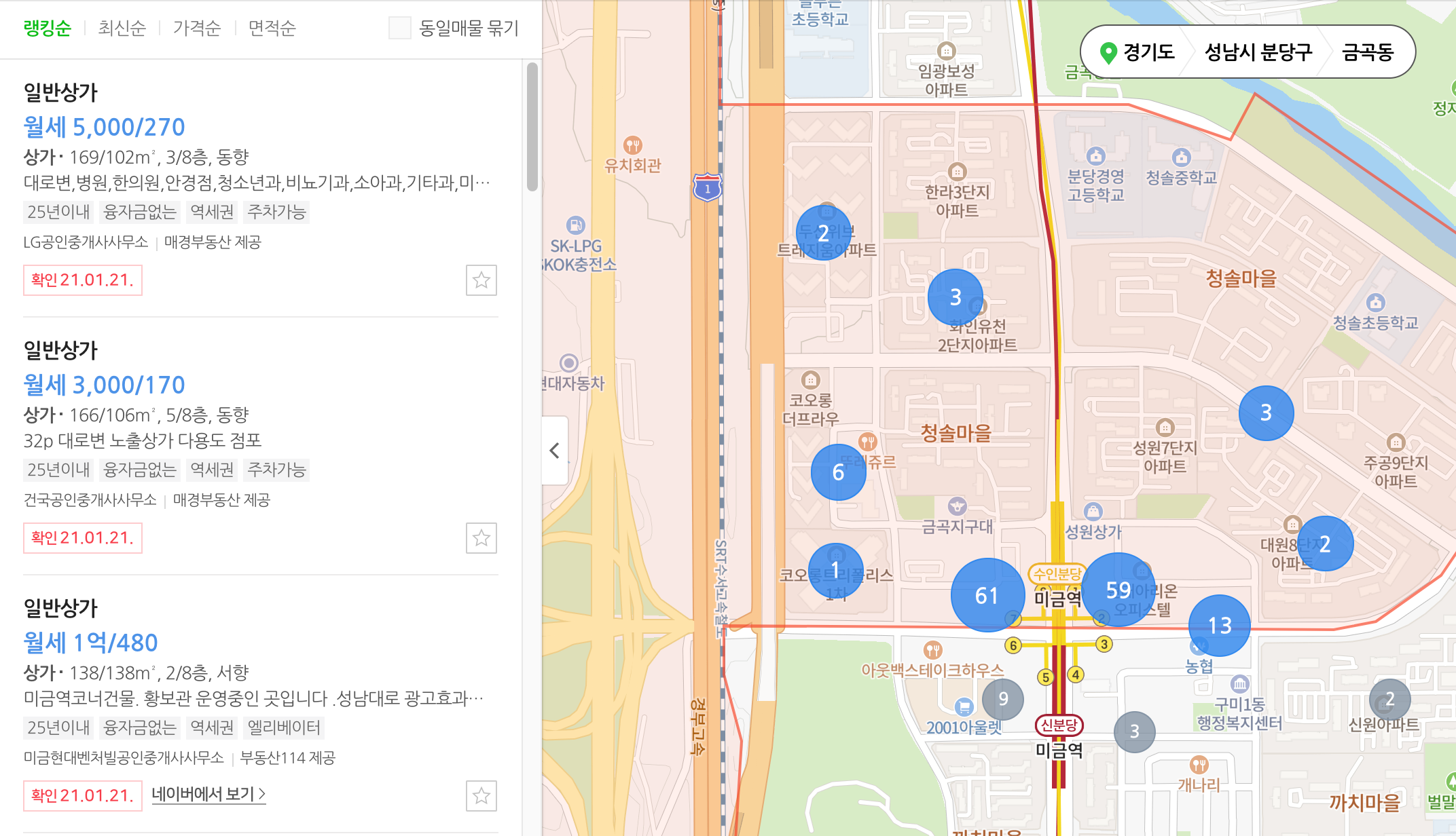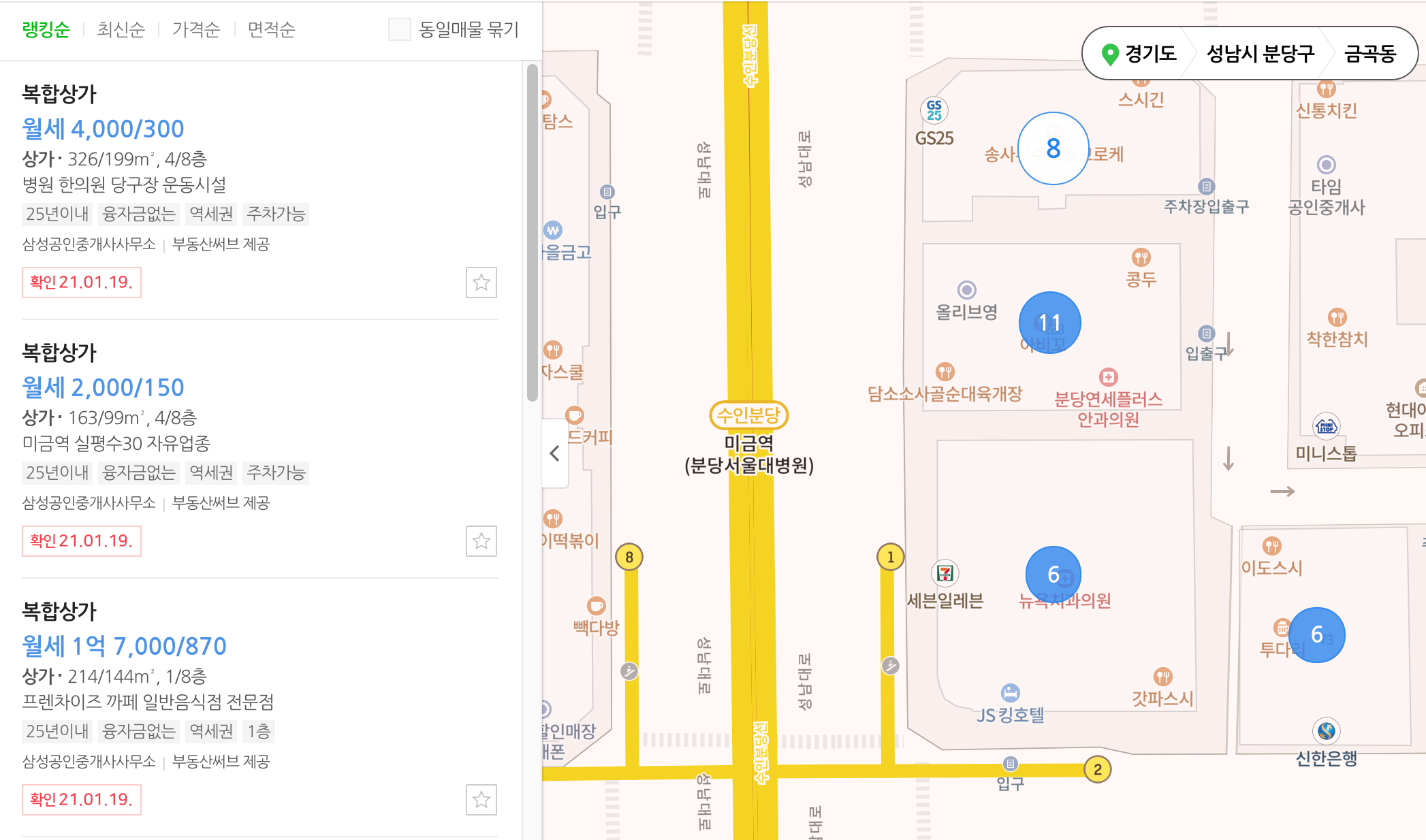 성남시 금곡동에서 상가를 확인했을때 가장 먼저 나오는 상가는 보증금 5000만 원에 월세 270만 원인 곳이다. 전용 102 제곱미터(30평)이고 계산을 해보면 8.6억으로 매매가를 산정할 수 있다. 두 번째 나오는 상가는 보증금 3000만 원에 월세 170이다. 전용 106 제곱미터(32평)이고 계산을 해보면 5.4억이다. 그리고 마지막으로 보증금 1억에 월세 480만 원인 상가는 41평이고 15.4억이다. 270만 원 / 30평을 해보면 평당 9만 원이고, 170만 원 / 32평을 해보면 5.3만 원이다. 시세를 들쑥날쑥해서 확인할 수 없으니 건물을 하나만 잡고 확인해 보겠다.