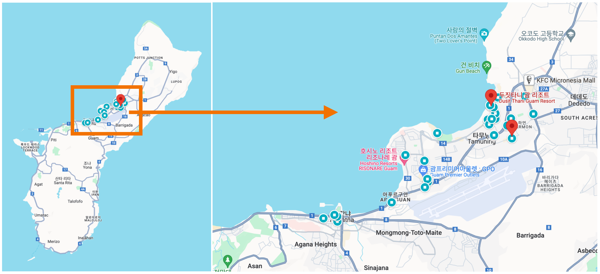 괌은 실제로 제주도의 1/3만한 사이즈인데 실제 모든 즐길거기는 아래 네모난 곳 타문 이라는 곳에 몰빵되어 있다. 이 몰빵된 곳에서도 우리는 가성비 또는 대존맛에만 포커스를 가지고 가야할 곳을 알아보겠다.
