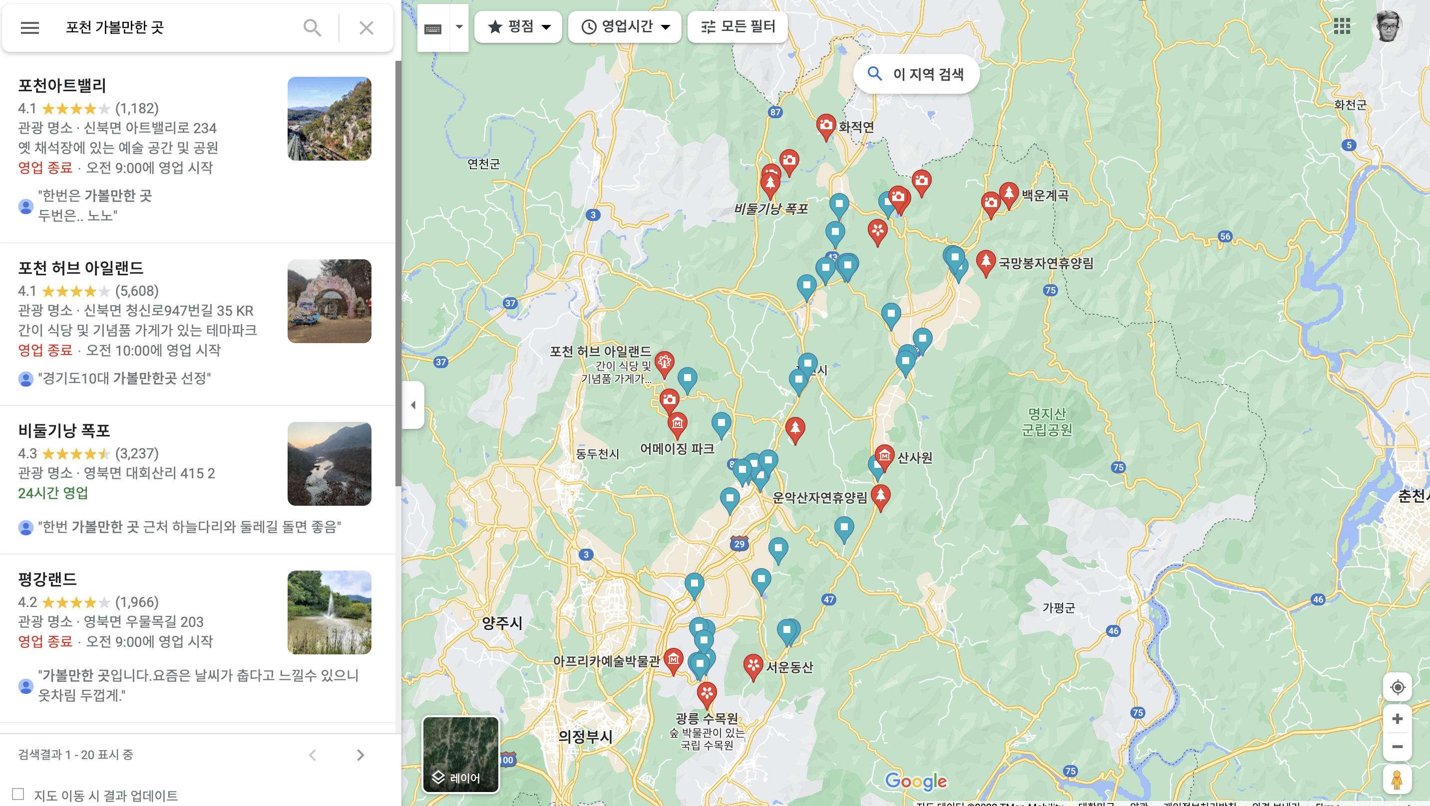 그리고 세 번째로 검색할 것이 바로 "지역 가볼만한 곳"이다. 포천을 예로 들어보면 "포천 가볼만한 곳"으로 검색하면 된다. 카페를 찾는 건 맛집과 동일해서 그렇게 신선하지는 않은데 "가볼만한 곳"이라는 검색어는 정말 어마어마한 기능이다. 이 검색어로 여행의 액티비티를 정할 수 있고 산책과 재미를 전부 잡을 수 있다. 카페와 맛집을 저장했다면 "가볼만한 곳"을 검색했을 때 아래와 같이 파란 장소들도 같이 볼 수 있는데 이것들이 바로 내가 저장한 장소이다. 이제 놀거리를 기준으로 가깝게 밥과 카페를 정하면 단기 여행 계획은 끝이다.