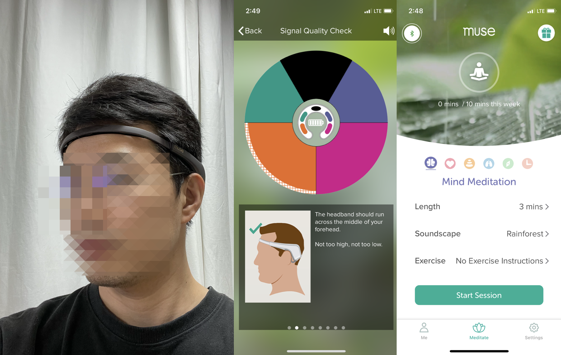 명상을 위해 Muse 앱을 스마트폰에 설치한다.(참고로 한글은 안된다.) 이메일로 간단하게 가입을 하면 바로 기기가 정상인지 확인한다. 이때 기기를 손오공의 긴고아처럼 착용하고 대기하고 있으면 뇌파를 잘 읽고 있는지 확인할 수 있다. 앱과 기기의 연결과 그리고 정확한 뇌파를 감지한 후에는 명상의 시간을 선택하고 명상에 들어갈 수 있다.