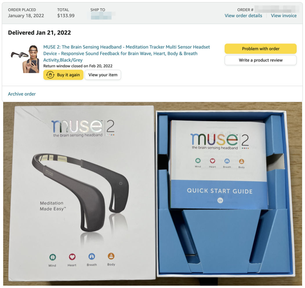 뮤즈라는 제품은 지금 2까지 출시된 상태이다. 국내에서는 정말 비쌌고 아마존을 통해서 2주 만에 물건을 받았다. 가격이 300 달러 가까이였는데 1년을 넘게 고심한 어느 날 133.99 달러로 할인하는 Muse2를 발견했고 정신없이 카드를 꺼내서 결제했다. 현재적인 기기로 손오공의 긴고아같이 생긴 제품이다. 박스는 조금 상처가 나있었지만 전혀 문제 되지 않았다.