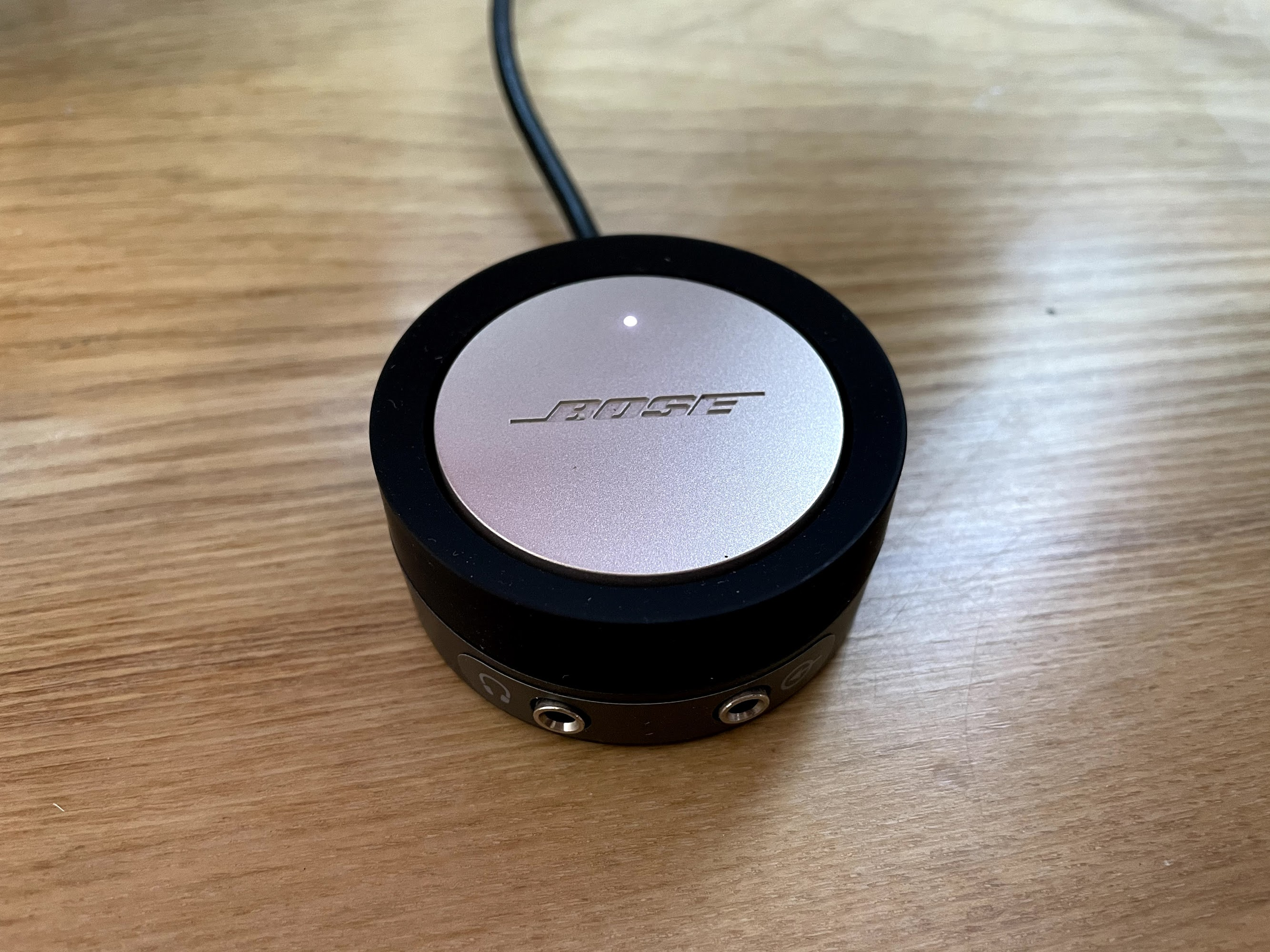 마지막으로 내가 정말 감탄한 부분이 있는데 바로 컨트롤러이다. 윗부분 BOSE라고 쓰여있는 스테인리스 부분을 가볍게 터치하면 On/Off가 된다. 이렇게 살짝 터치했는데도 될까 할 정도로 빠릿빠릿한 반응을 보여준다. 그리고 태두리를 시계방향으로 돌리면 볼륨이 오르고 반대방향으로 돌리면 볼륨이 내려온다. 이 컨트롤러로 태두리를 돌리는 쾌감은 정말 돌려본 자만 알 거 같은데 정말 부드럽다. 그리고 전면 하단에 이어폰과 마이크를 꼽을 수 있는 곳이 있어서 자료를 만들 때 간편한 인풋/아웃풋 기능으로 굉장히 유용할 것 같다.