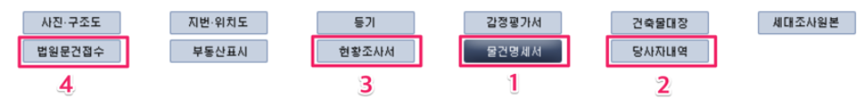 물건명세서, 당사자내역, 현황조사서, 법원문건접수를 말한다.