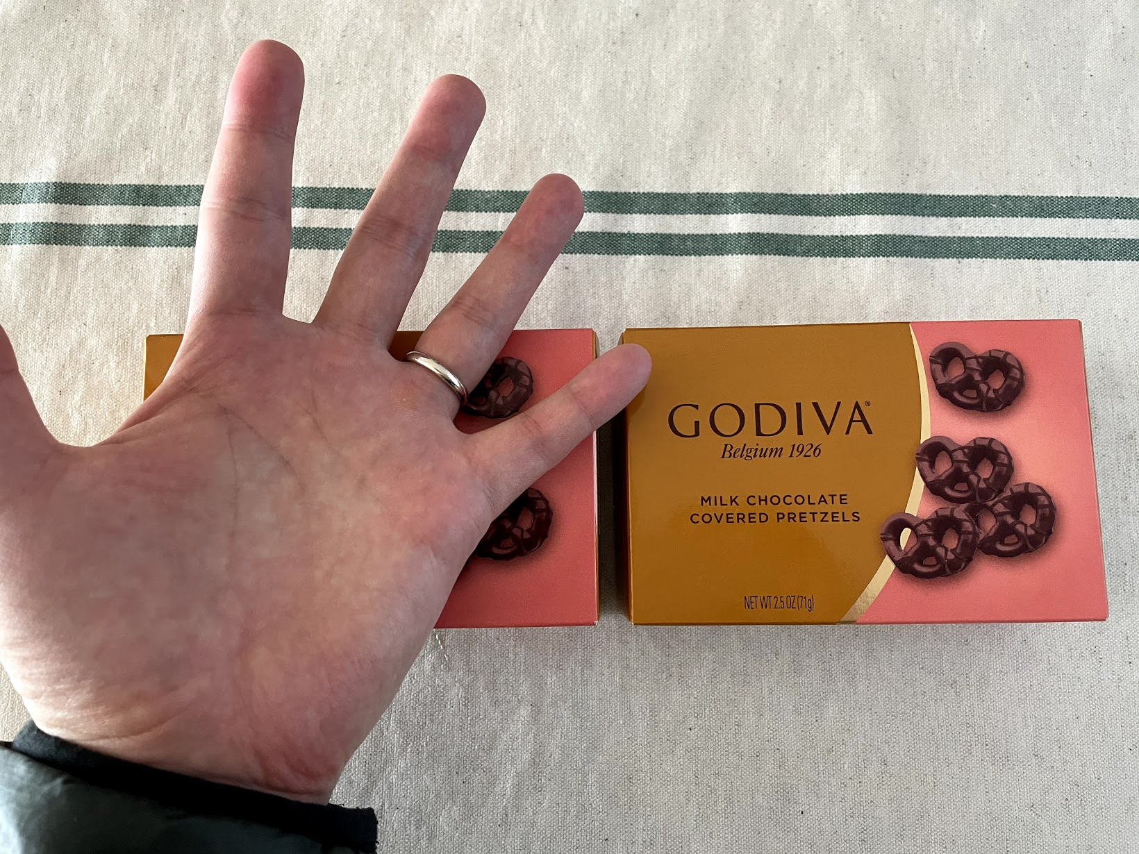 삼진 미니 프레첼을 먹다가 달달한게 필요할 때가 있다. 이럴 때 선택할 수 있는 것이 고디바 프레첼이다. 가격은 브랜드가 브랜드인 만큼 좀 된다. 하지만 맛은 브랜드가 브랜드인 만큼 정말 맛이 기가 막히게 좋다. 이 상품은 직구하는 것이 가격이 가장 싸지만 배송비 포함하고 기다리는 시간을 포함하면 싸지는 않다. 크기는 다양하지만 454g짜리 통이 가장 유명하다. 가격은 배송비 포함하면 4만 원 정도 한다. 인간 사료라고 하기엔 좀 비싸다.