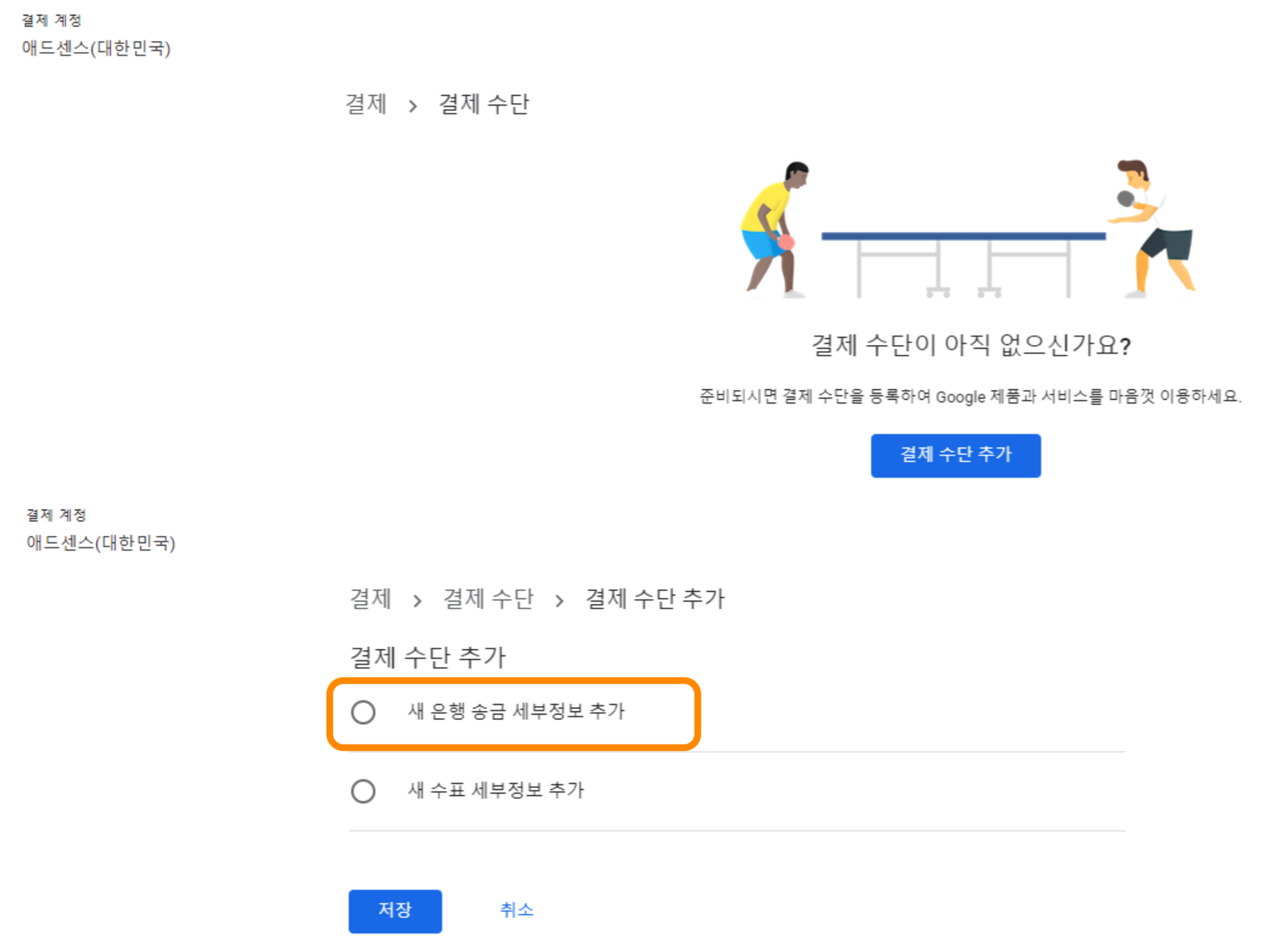 업데이트 버튼을 누르면 결제수단 추가를 추가로 눌러줘야 하고 이후에 새은행 or 새 수표를 선택하면 되는데, 기본빵으로 새 은행으로 송금받는 것이 미국이 아닌 타국에서 유리하다. 새 수표로 받으면 그만큼 발품도 팔아야 하고 손가락이 발가락을 써서 바삐 움직여야 할 것이므로 나는 무조건 "새 은행 송금 세부 정보 추가"로 하기로 했다.