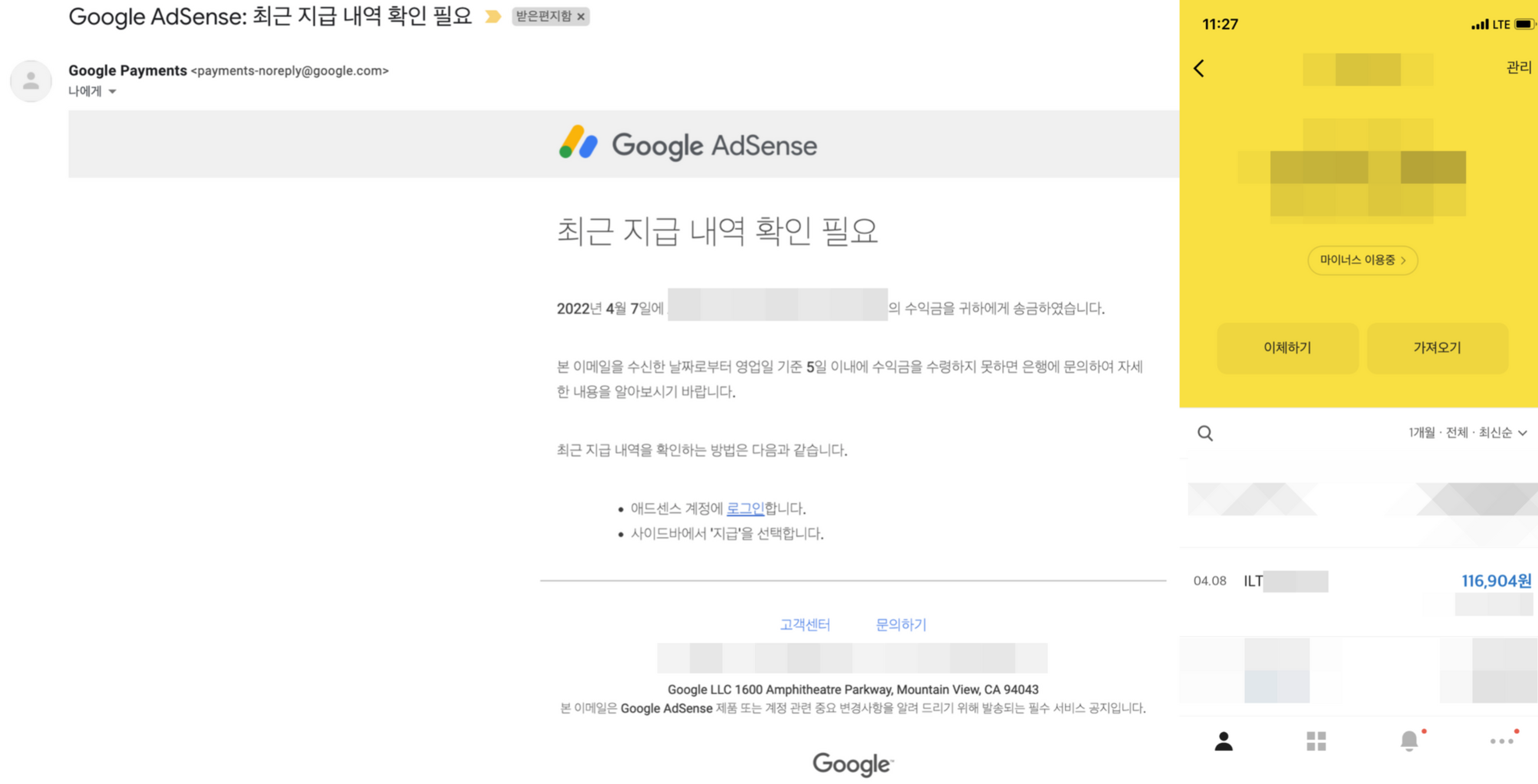 입력이 완료되고 저장을 하게되면 "최근 지급 내역 확인 필요"라는 메일이 나의 메일함에 들어오게 된다. 나는 이 메일을 받기까지 1일은 걸린 것 같다. 바로 메일을 받게 되는 건 아니니 차분하게 기다려 본다. 메일을 확인하고 애드센스 계정에 로그인하면 붉은색으로 표시된 "지급 보류" 경고가 없어진 것을 확인할 수 있다. 그리고 또 하루가 지나면 ILT로 시작하는 곳에서 애드센스 비용이 입금된 것을 통장에서 확인할 수 있었다.