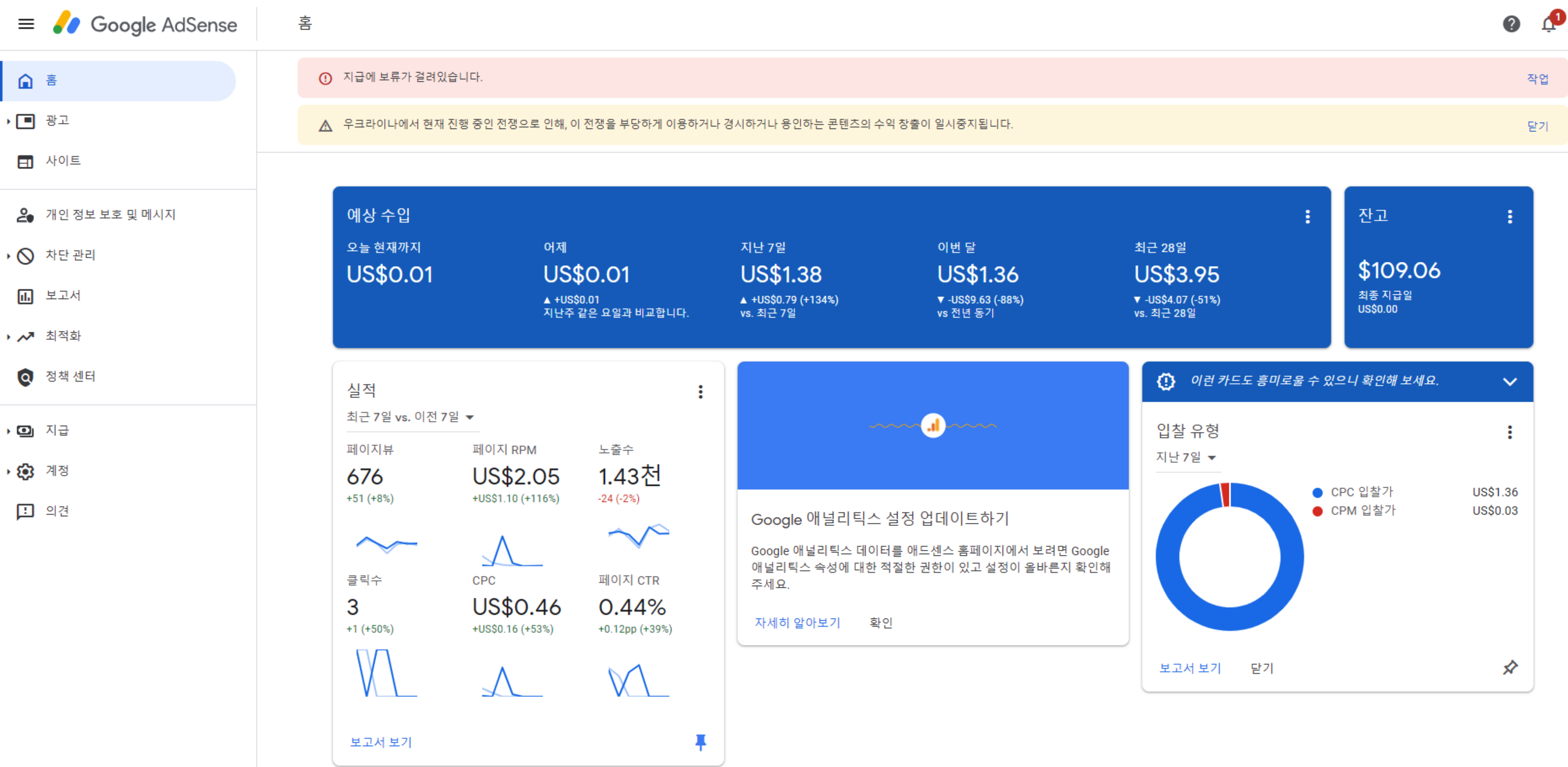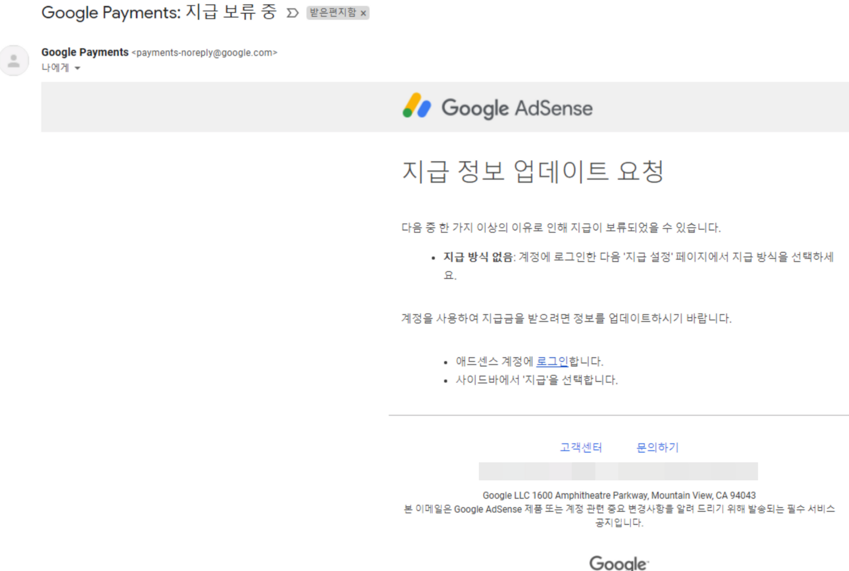 구글이 나에게 메일을 보냈다. "지급 보류 중"이라는 메일인데 지급 정보를 업데이트를 하라는 내용이다. 그렇다는 건 이제 첫 출금이 가능한 100달러를 나의 블로그가 달성했다는 의미가 된다. 한동한 블로그에 글을 자주 올렸는데, 그때도 지금도 돈을 출금할 수 있을 가라는 걱정이 계속 들었는데 이런 메일을 받게 되니 감회가 새롭다.