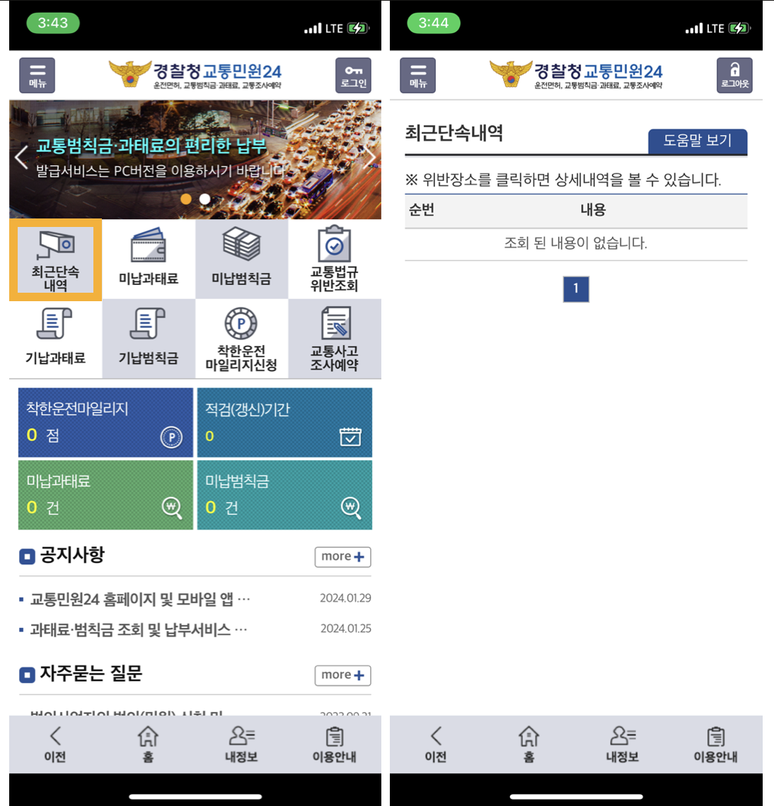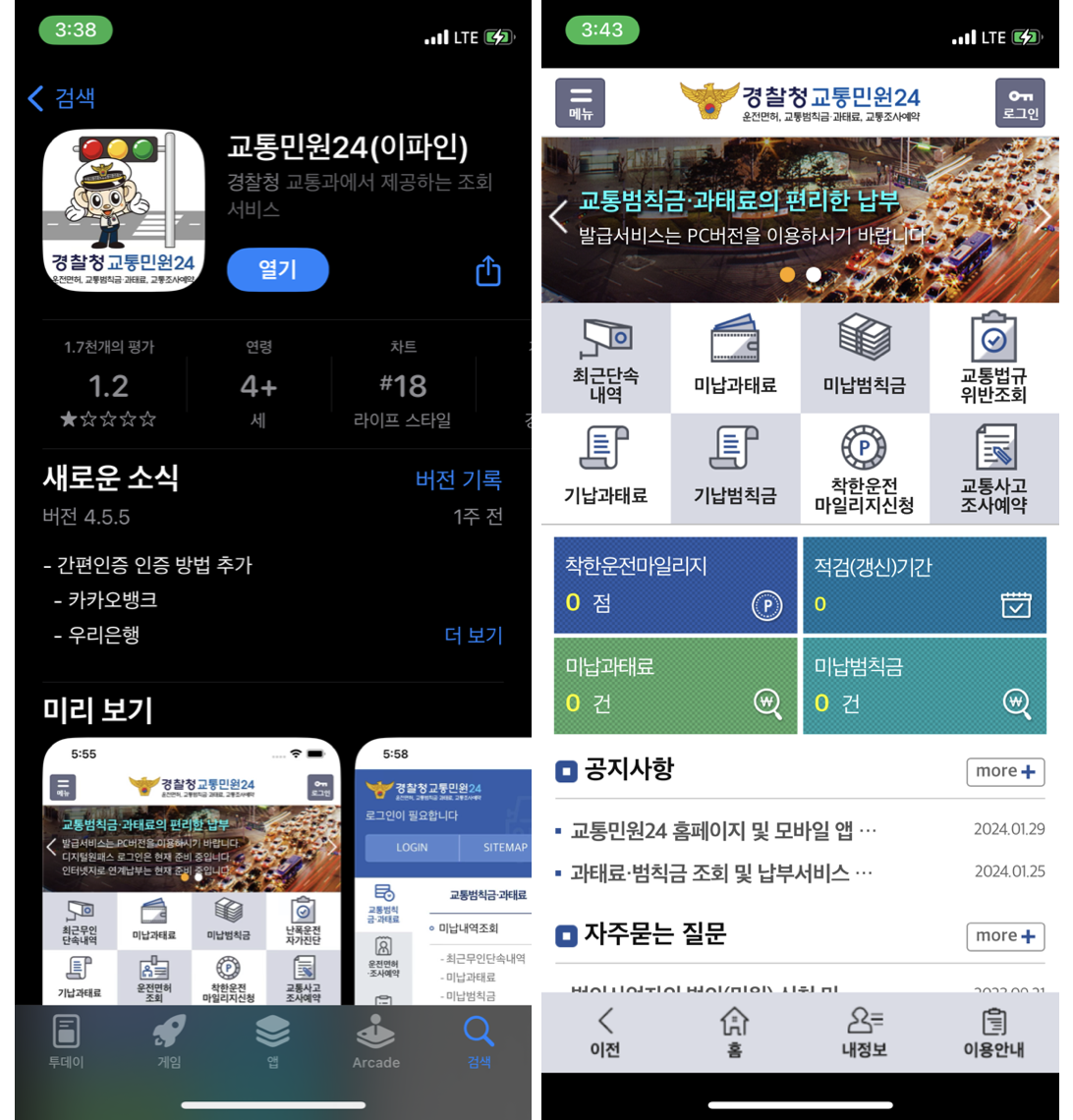 앱스토어 또는 구글플레이에 들어가서 "교통민원 24"를 검색합니다. 무료 앱으로 버전은 꾸준히 업데이트되고 있습니다. 글 쓰는 시점인 지금도 일주일 전에 업데이트가 있었다는 것을 알 수 있었습니다.(현재 4.5.5 버전) 이 말은 한번 앱을 다운로드하면 앞으로 두고두고 사용할 수 있다는 의미와 직결됩니다. 앱을 다운로드하고 실행하면 아래와 같은 화면을 만날 수 있습니다.