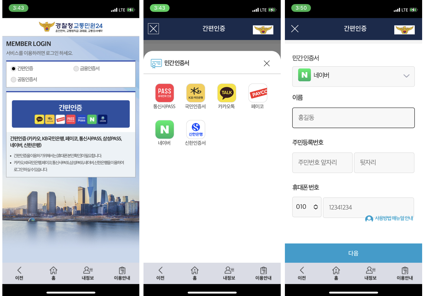 교통민원24 앱은 아래와 같인 통신사(SK, KT 등), 은행(국민은행, 신한은행), 포인트(페이코), 네이버를 지원합니다. 대한민국 사람이라면 피할 수 없는 서비스들을 두루두루 지원하고 있습니다. 정말 회원가입으로 발생하는 고통은 없는 편입니다.