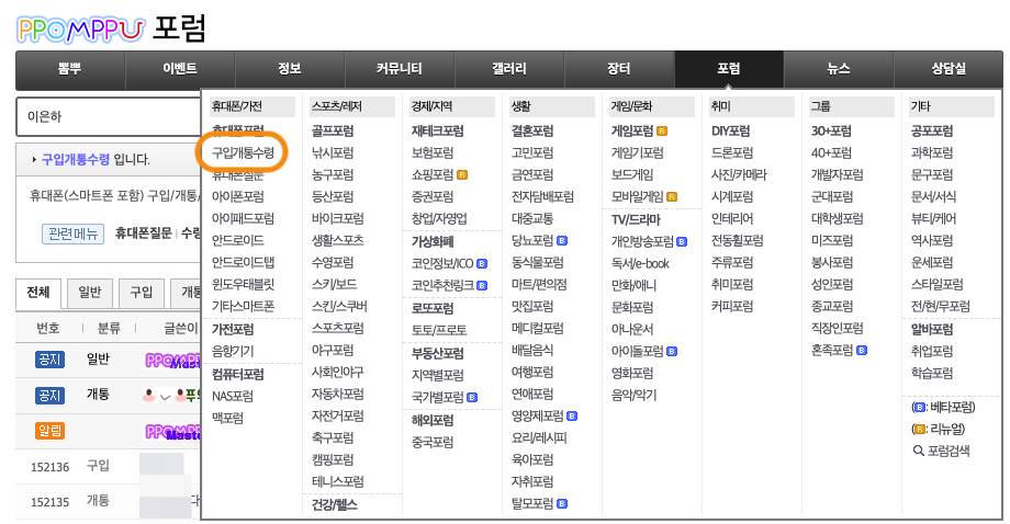 뽐뿌는 포럼으로 이동해서 구입개통수령 게시판으로 이동한다.