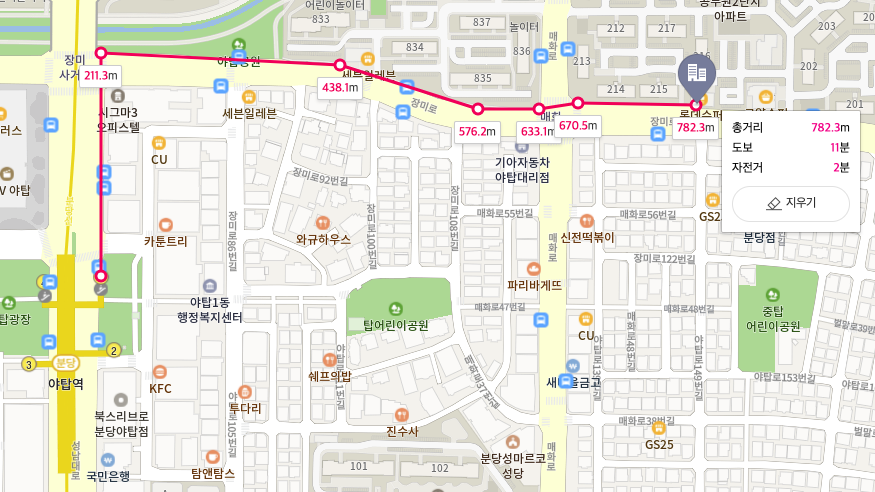 야탑에서 걸어가면 10분 정도 소요된다. 700미터 거리이니 살살 걸어가면 된다.