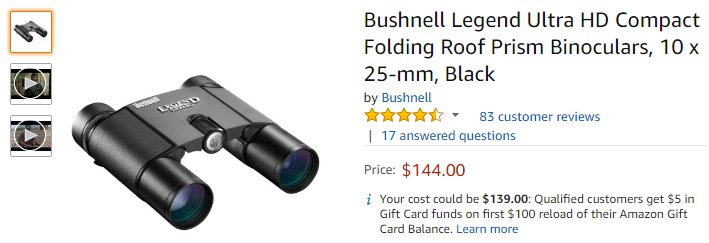 그래서 고른 녀석이 Bushnell Legend Ultra HD, 10 x 25-mm, Black 되시겠다.