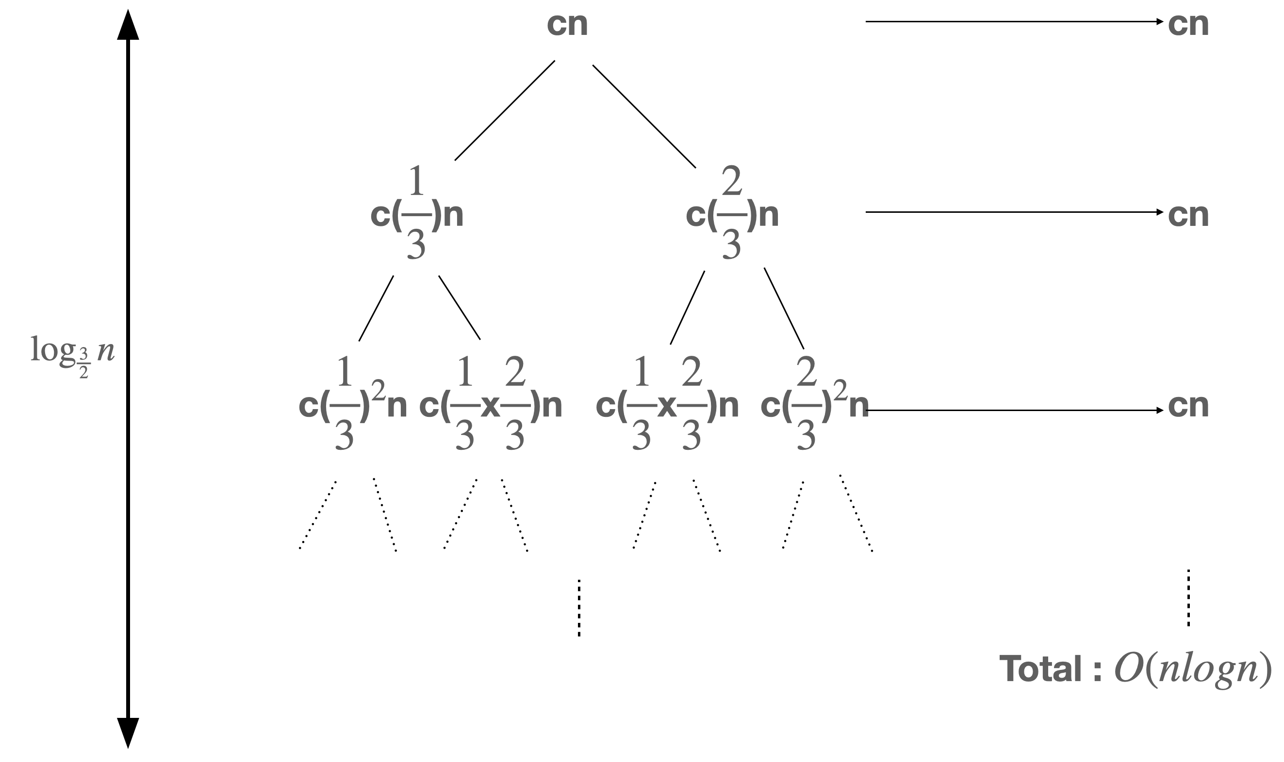 전체 Cost를 알기위해서는 $T(n) = \sum\limits_{i=0}^{log_{3\over2}n}cn$ 를 계산해야 한다. ${cn}\sum\limits_{i=0}^{log_{3\over2}n}1$ 이 되고 이건 $cn+cn+....+cn$ = $\log_{3\over2}n+1$ 과 같다.  이 말은 $cn(1+1+1+...+1)$ = $cn(\log_{3\over2}n+1)$ 이라는 말과 같다. 마지막으로 cn보다 $cn\log_{3\over2}n$ 이 더 긴 시간을 가지므로 cn은 무시되어 $O(nlogn)$ 이 된다.