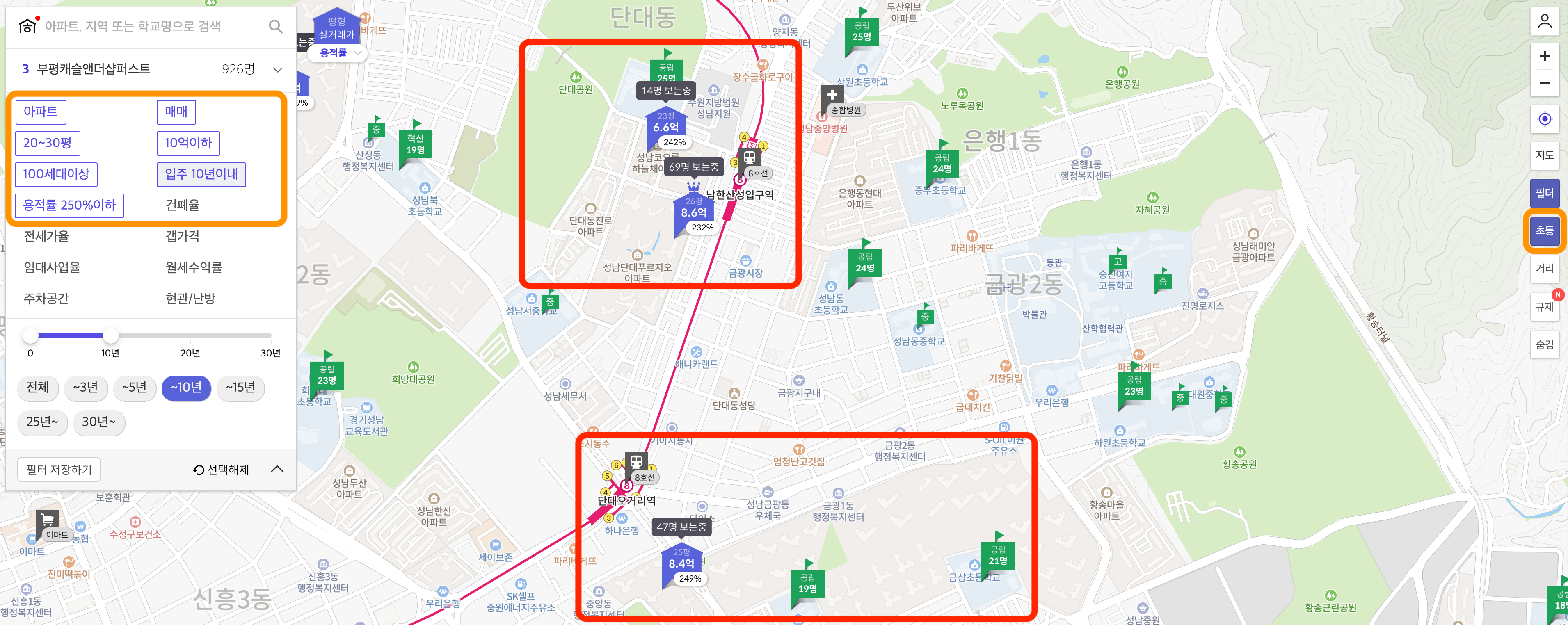 먼저 호갱노노에 들어가서 주요 일자리 장소(강남, 여의도, 판교)와 멀지 않은 곳을 선택한다. 그 후 교통이 있는 곳과 가까운 아파트를 찾는다. 그리고 필터를 아파트, 매매, 20~30평, 10억 이하, 100세대 이상, 입주 10년 이내, 용적률 250%이하 라고 지정해 놓는다. 그리고 오른쪽에 학교를 초등으로 맞춰 놓고 마음에 드는 아파트가 나올때까지 반복한다.