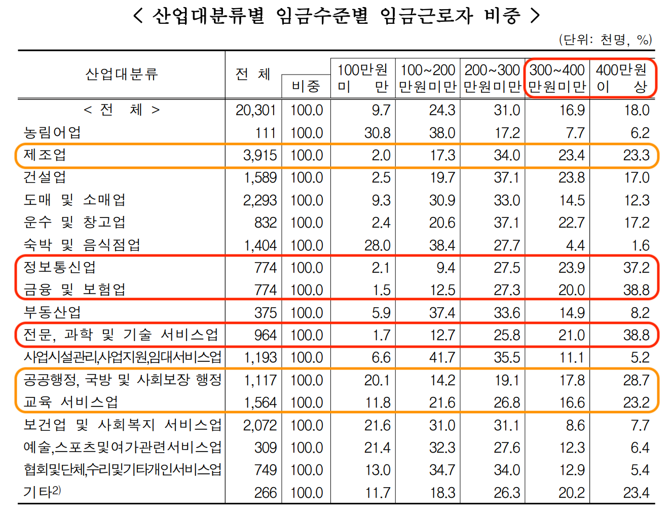 첫번째는 일자리이다. 이 중 임금근로자 비중을 먼저 확인해보는 것이 좋다. 통계청에서 상반기 하반기 나눠서 통계 정보를 공유한다. 표를 보면 300~400만원 이상의 지표가 가장 높은 것을 본다. 그러면 "금융 및 보험", "전문, 과학 및 기술 서비스업", "정보통신업" 이 3가지가 가장 높은 것을 알 수 있다. 그럼 이 3가지가 많은 도시의 아파트를 선택하는 것이다.