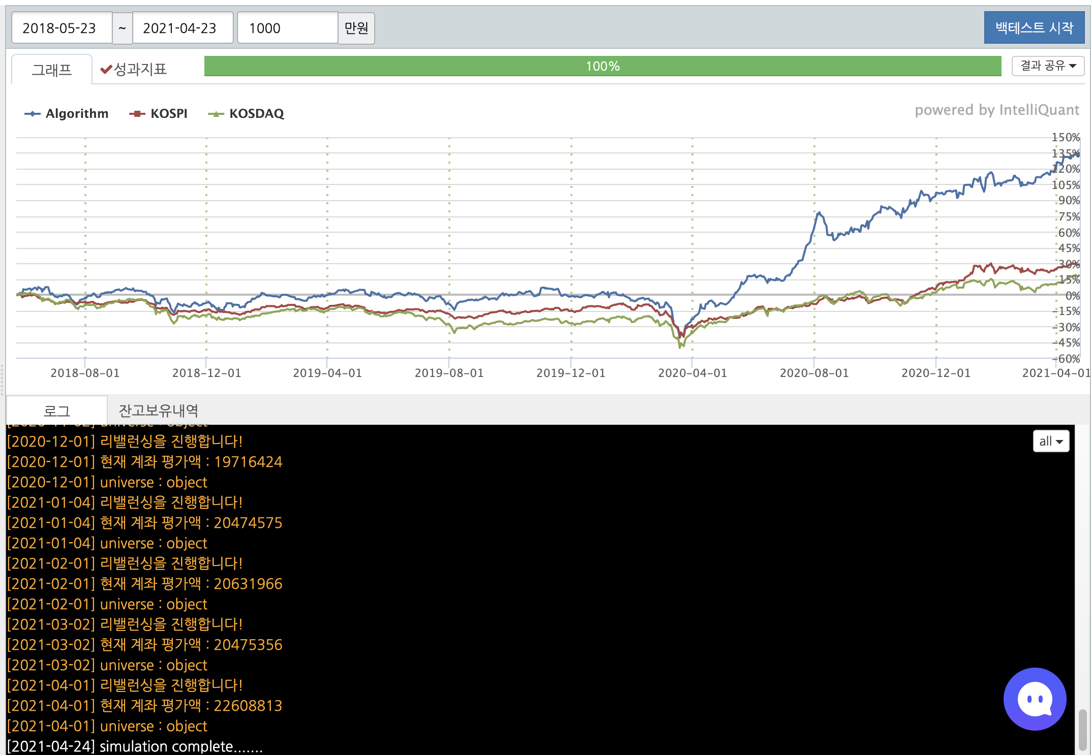 인텔리퀀트는 2000년부터의 주식 거래 데이터를 모두 가지고 있다. JavaScript로 2000년부터 모든 거래 데이터를 활용해서 나의 이론을 검증할 수 있다. 또한 책에서 얻은 아이디어를 코드로 구현해서 책이 말하는 이론을 검증할 수도 있다. 나 또한 책에서 얻은 아이디어를 통해서 3년간 1000만 원을 투자해서 2200만 원을 만들 수 있는 알고리즘을 쉽게 만들 수 있었다.