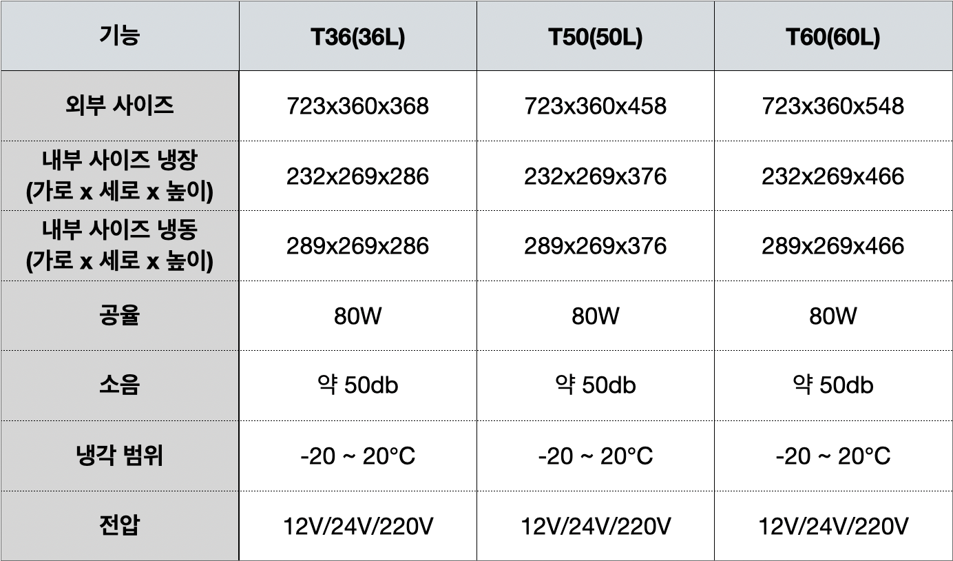 마지막은 알피쿨의 T 시리즈이다. 이 제품은 왜 전 시리즈를 설명하냐면 기능적으로 가장 마음에 들기 때문이다. T 시리즈는 T36, T50, T60으로 사이즈가 3개로 나뉜다. 기능은 같고 크기로 구분되는 것이다. T36은 550ml 생수 28개가 들어가고 T50은 550ml 생수 38개가 들어가고 T60은 550ml 생수 45개가 들어간다. 크기도 다양하지만 내부가 정말 끝내준다. 바로 냉장과 냉동을 동시에 할 수 있기 때문이다. 앱으로 전부 컨트롤 가능하며 바퀴까지 있어서 이동이 편리하다. 정말 가장 강추하는 제품이 아닐 수 없다.