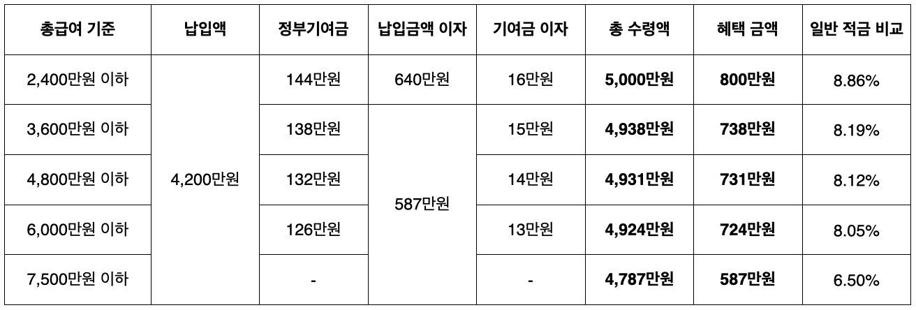 총 급여액 기준으로 시중은행에 매달 70만 원씩 납입했을 경우, 아래와 같이 수령하게 된다.