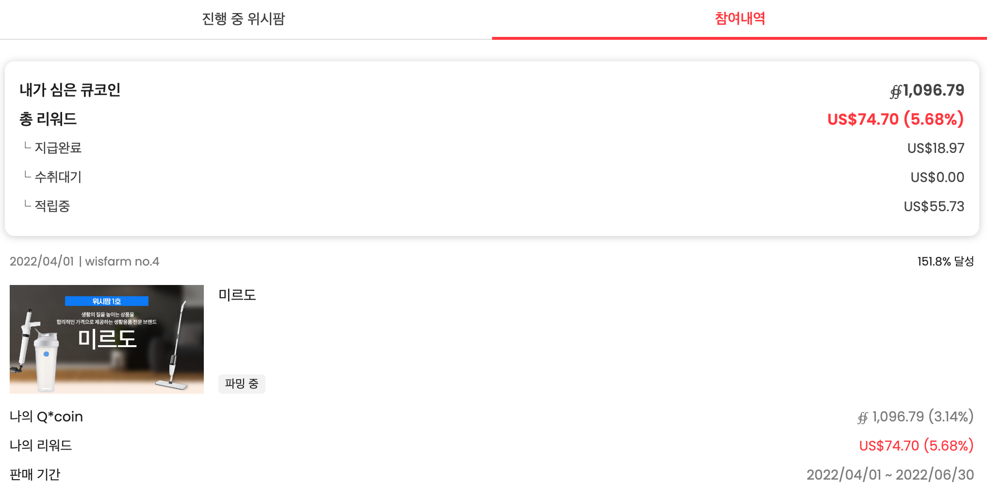 위시팜에 참여하게 되면 3개월간 큐코인이 묶이게 된다. 그리고 매달 20일날 수익을 얻을 수 있다. 나는 내용을 듣자마자 1200개의 큐코인을 마메큐를 사용하여 10% 할인을 받아 구매했다. 위시팜 활성화를 위해서인지 Q라운지에서 룰렛을 돌리면 마메큐 10개가 마구 쏟아졌다. 그리고 유니패스 환급을 통해 추가 10% 공제를 받아서 구매했다.