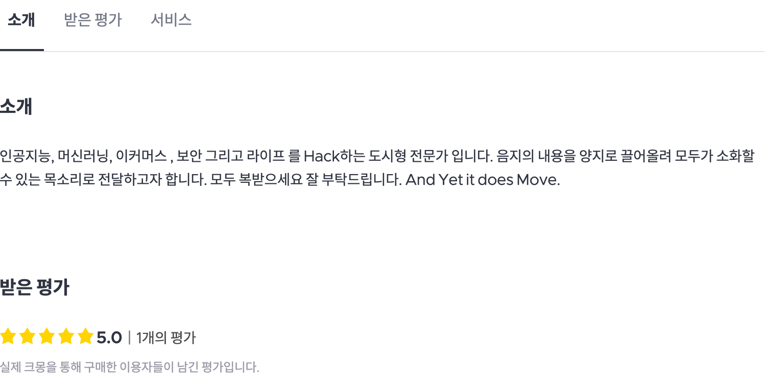 이미지만 제대로 넣어주고 비어있는 곳에 글을 전부 채웠다면 크몽에서 광탈할 일은 없다. 나의 기술을 판매할 수 있는 곳이기 때문에 나의 전문성을 잘 알릴 수 있는 이미지여야만 한다. 그리고 크몽쪽에서도 나를 검증할 수 있는 데이터가 게재되어야 등록 허가를 내주는 명분이 생긴다. 부디 이미지에 신경써서 소중한 시간을 낭비하지 않았으면 한다.