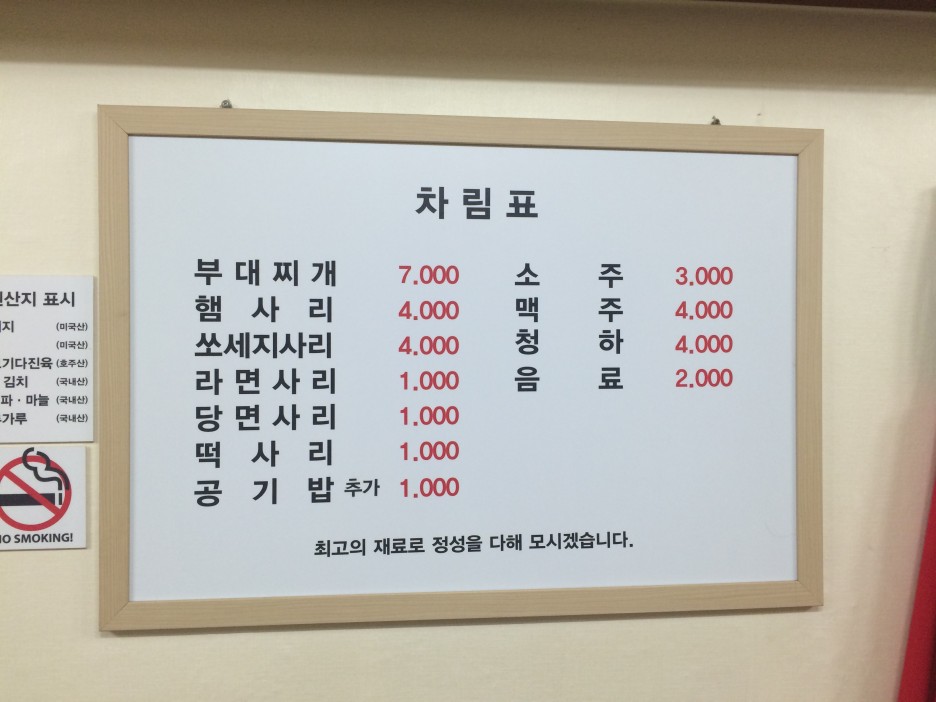 메뉴는 부대찌게만 판매하며 가격은 7000원으로 적당하다.