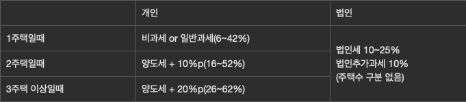 개인은 1 주택일 때는 양도세가 비과세가 되거나 일반과세를 한다. 하지만 2 주택으로 넘어가면서부터 양도세 + 10%의 중과 세율을 맞는다. 3 주택으로 넘어가면 더하면 더했지 덜하진 않는다. 근대 법인은 단지 법인세 10~25%와 법인추가과세 10%만 내면 된다. 그래서 법인은 단타에서 수익이 좋은 편이다.