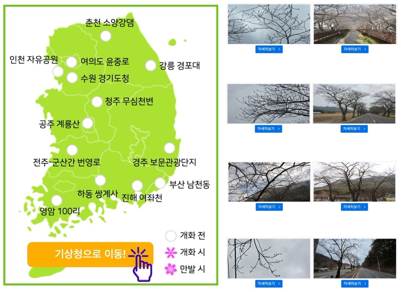 기상청에서는 벚꽃이 피고 있는지 아닌지를 지도로 안내해주고 있어요.