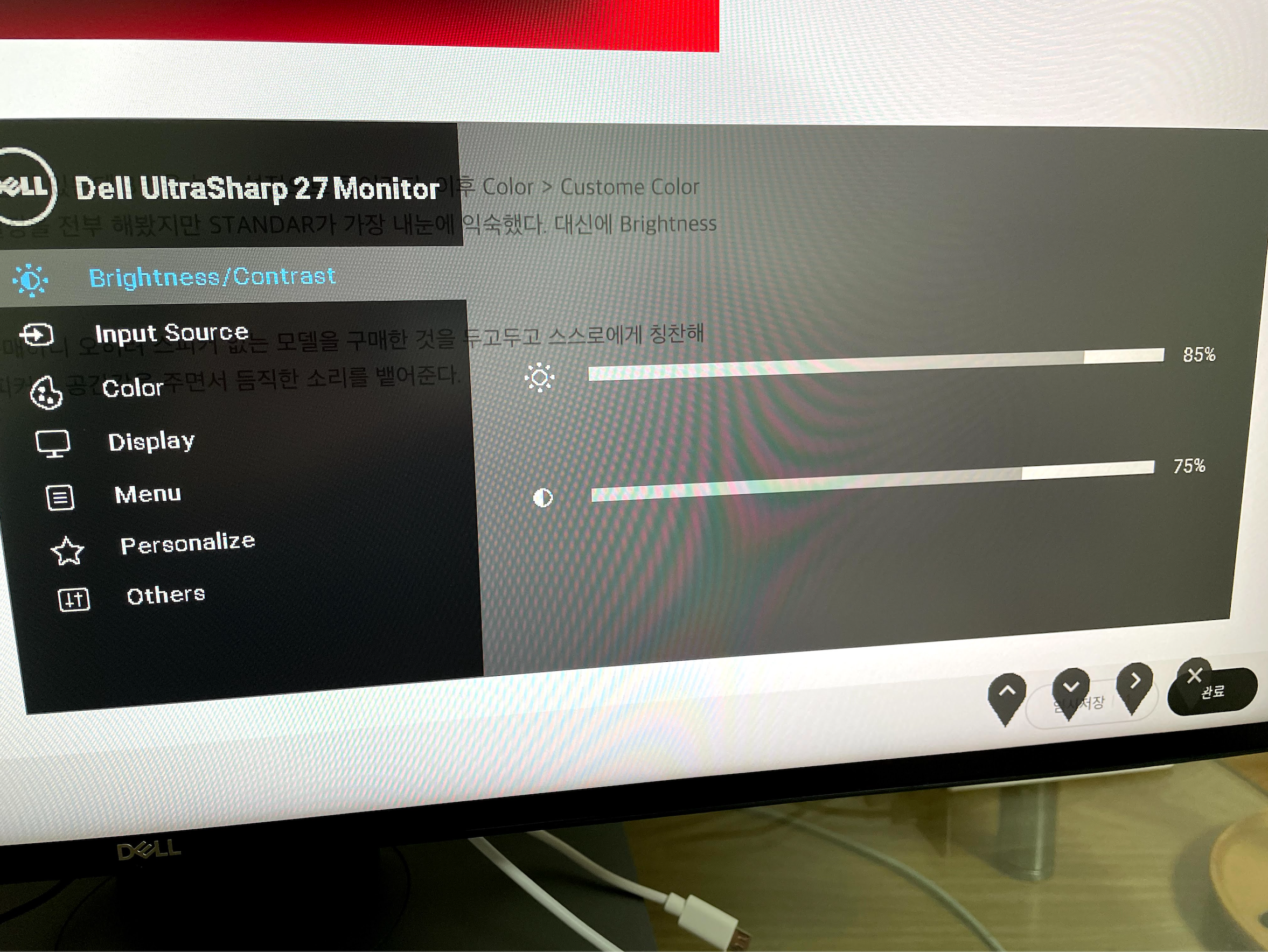 모니터를 바라보고 우측 하단에 5개의 버튼이 있다. 1,2,3,4,5 버튼이 있는데 3번을 눌러 설정으로 들어간다. 이후 Color > Custome Color로 이동하여 RGB설정을 진행한다. 누군가가 추천한 방식으로 설정을 전부 해봤지만 STANDAR가 가장 내눈에 익숙했다. 추가로 Brightness 85%, Contrast 75%를 적용하는게 훨씬 보기 편했다.