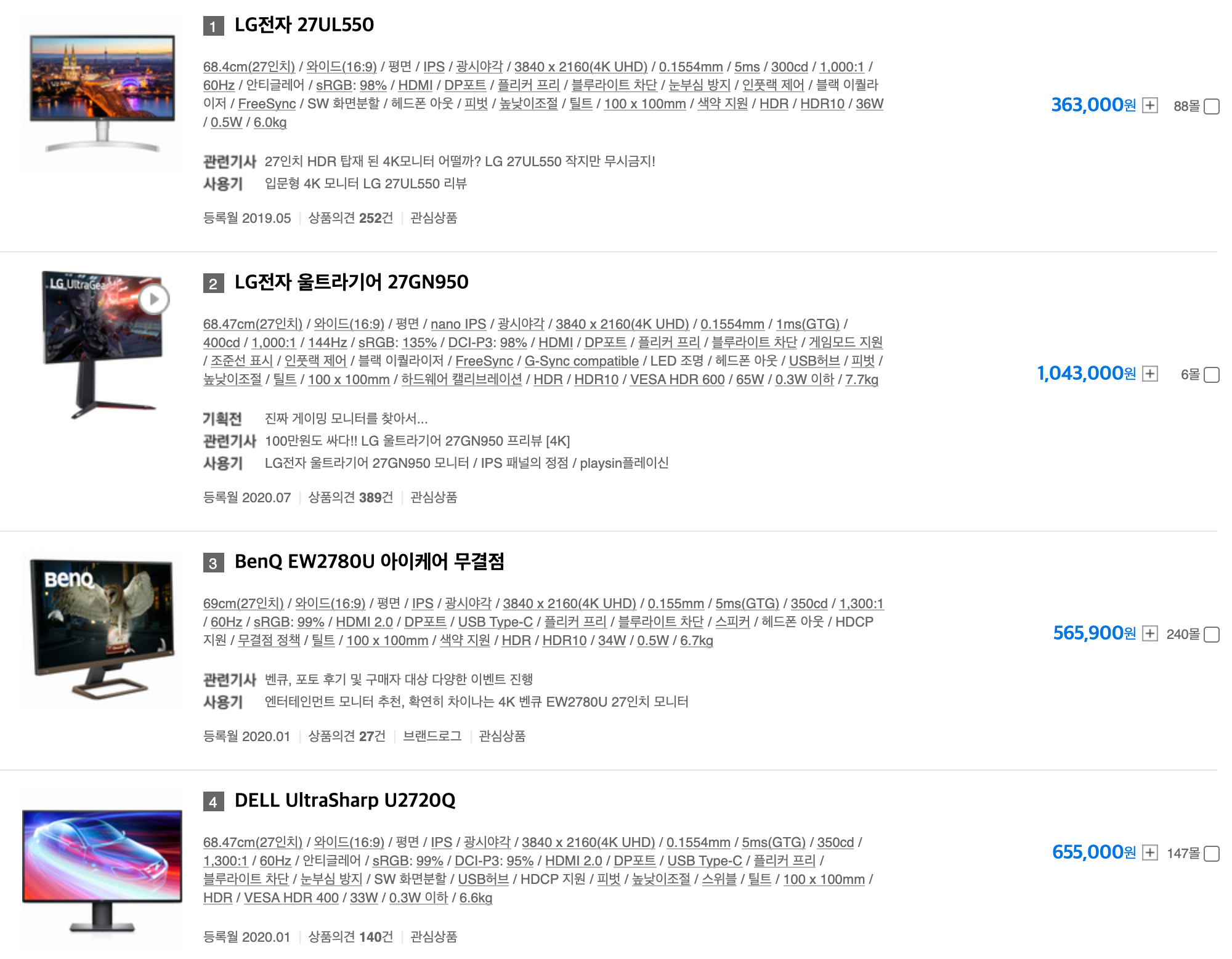 처음에는 기존 모니터와 마찬가지로 30인치 이상을 생각했다. 그래야 여러 창을 띄우고 사용할 때 불편함이 없을 것 같았기 때문이다. 그래서 30인치 이상을 계속 찾아봤는데 가격도 너무 비싸고 마음에 드는 모델도 발견할 수 없었다. 그래서 우연히 27인치를 찾아봤는데 오히려 이쪽에 경쟁력이 있는 제품들이 많았다. 최종 선택 목록에서 4종류의 4K모니터가 물망에 올랐다.
