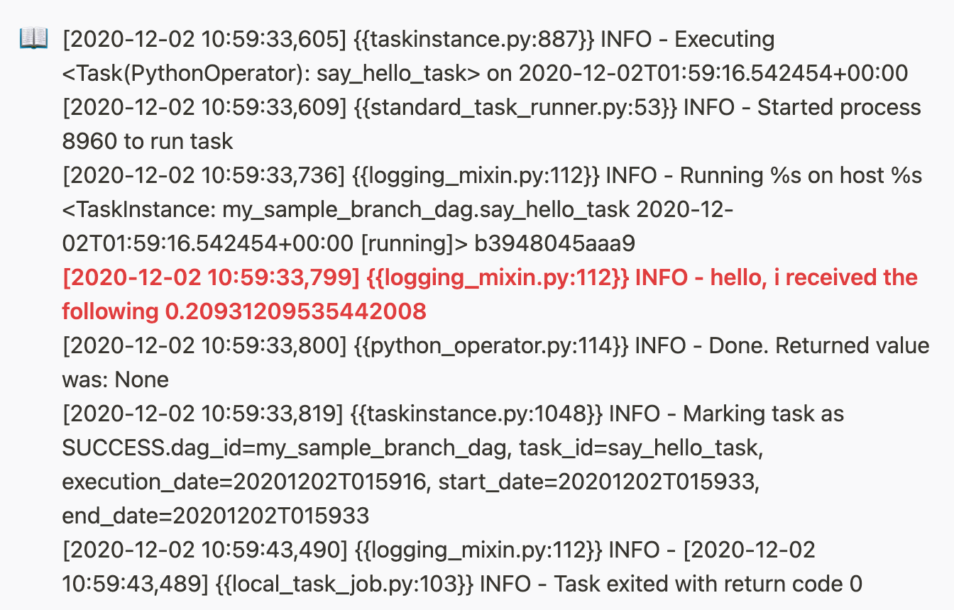dag들을 연결할 때, Condition을 줘서 조건에 따라 사용 유무를 정할 수 있다. random.random() > 0.5가 참 일 경우 'Hi' 를 출력하고random.random() < 0.5가 참 일 경우 'Hello'를 출력한다. 위 코드를 실행한 결과 랜덤 값에서 0.2093120953544 을 얻었고 0.5보다 작으므로 Hello를 출력하는 say_hello_task를 호출한다. 해당 task로 이동하면 "hello, i received the following 0.20931209535442008" 라고 로그에 출력하고 상태가 초록색인 "success"가 된다.