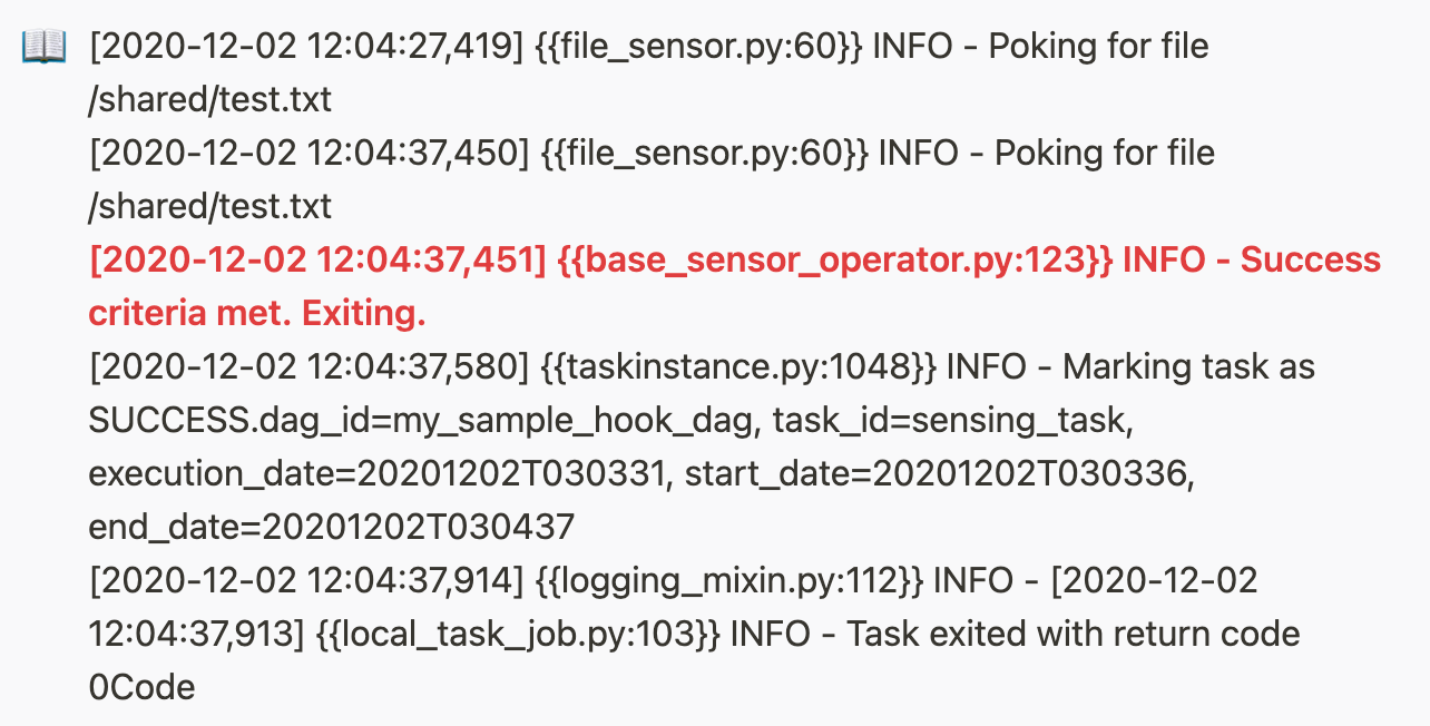 FSHook의 FS는 파일 시스템이다. 이 기능은 특정 파일을 모니터링하고 있다가 인풋이 들어왔을 때, 다음 dag로 이동하게 한다. poke_interval을 통해서 몇 회 리스닝하고 있을지를 정할 수 있다. 코드에서는 "Poking for file /shared/test.txt" 라는 로그를 10회 남긴다. "gogogogoGo~" 라는 텍스트를 echo 명령어로 test.txt 파일에 삽입했다. 이 후 "gogogogoGo~" 라는 텍스트가 test.txt에 입력이 되었을 때, Success가 되면서 다음 dag로 이동한다.