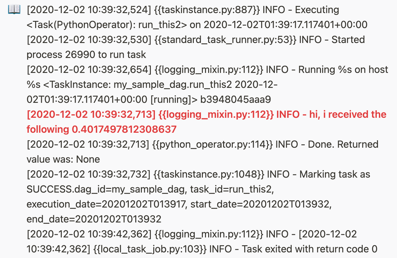 dag들을 연결할 때, Condition을 줘서 조건에 따라 사용 유무를 정할 수 있다. random.random() > 0.5가 참 일 경우 'Hi' 를 출력하고random.random() < 0.5가 참 일 경우 'Hello'를 출력한다. 위 코드를 실행한 결과 랜덤 값에서 0.2093120953544 을 얻었고 0.5보다 작으므로 Hello를 출력하는 say_hello_task를 호출한다. 해당 task로 이동하면 "hello, i received the following 0.20931209535442008" 라고 로그에 출력하고 상태가 초록색인 "success"가 된다.
