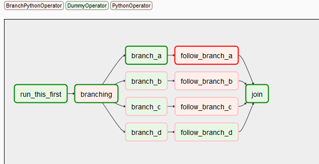 | SequentialExecutor(기본) | 이름에서 알 수 있듯이 작업은 순차적으로 실행됩니다. 분기 연산자가 있어도 작업은 ’branch_a’, ‘branch_b’, ‘branch_c’, ‘branch_d’ 순서대로 하나씩 실행된다. SequentialExecutor는 SQLite와 함께 사용 가능하다. |