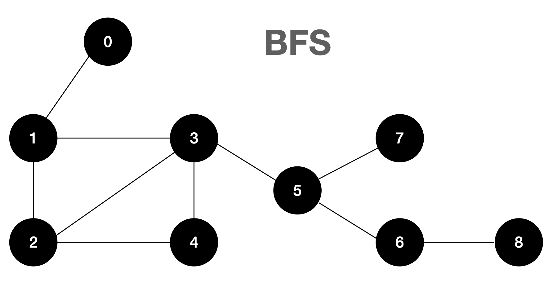 BFS는 큐(Queue)를 사용해서 구현한다. 시작 노드를 넣고 자식 노드를 하나씩 넣는데 한번 넣었던 자식은 다시 넣지 않는다. DFS가 움직이는 것을 예제로 확인해 본다.