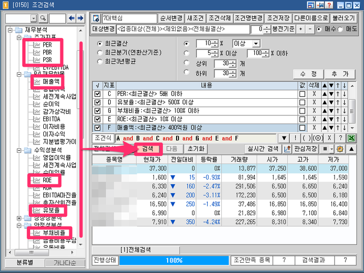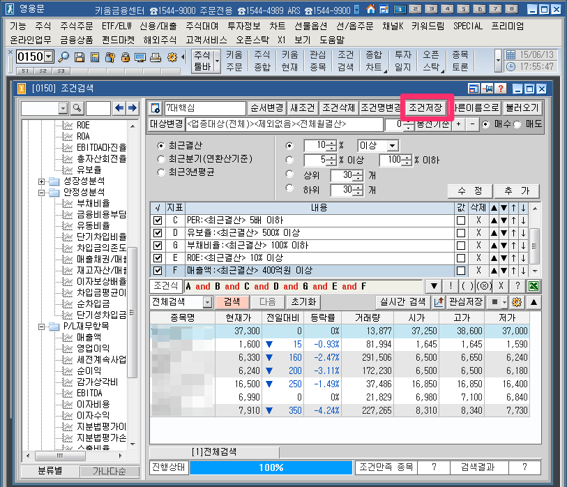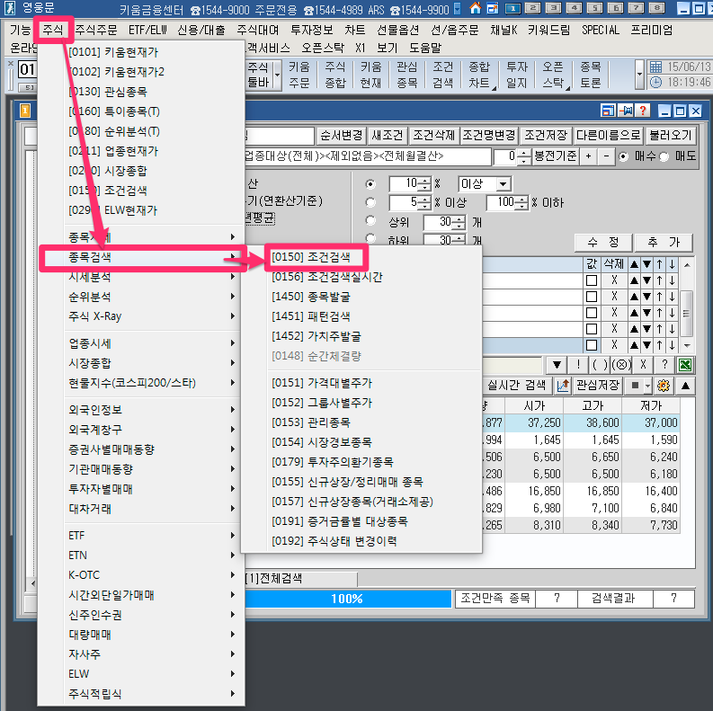 영웅문 -> 주식 -> 종목검색 -> 조건검색 순으로 이동한다.