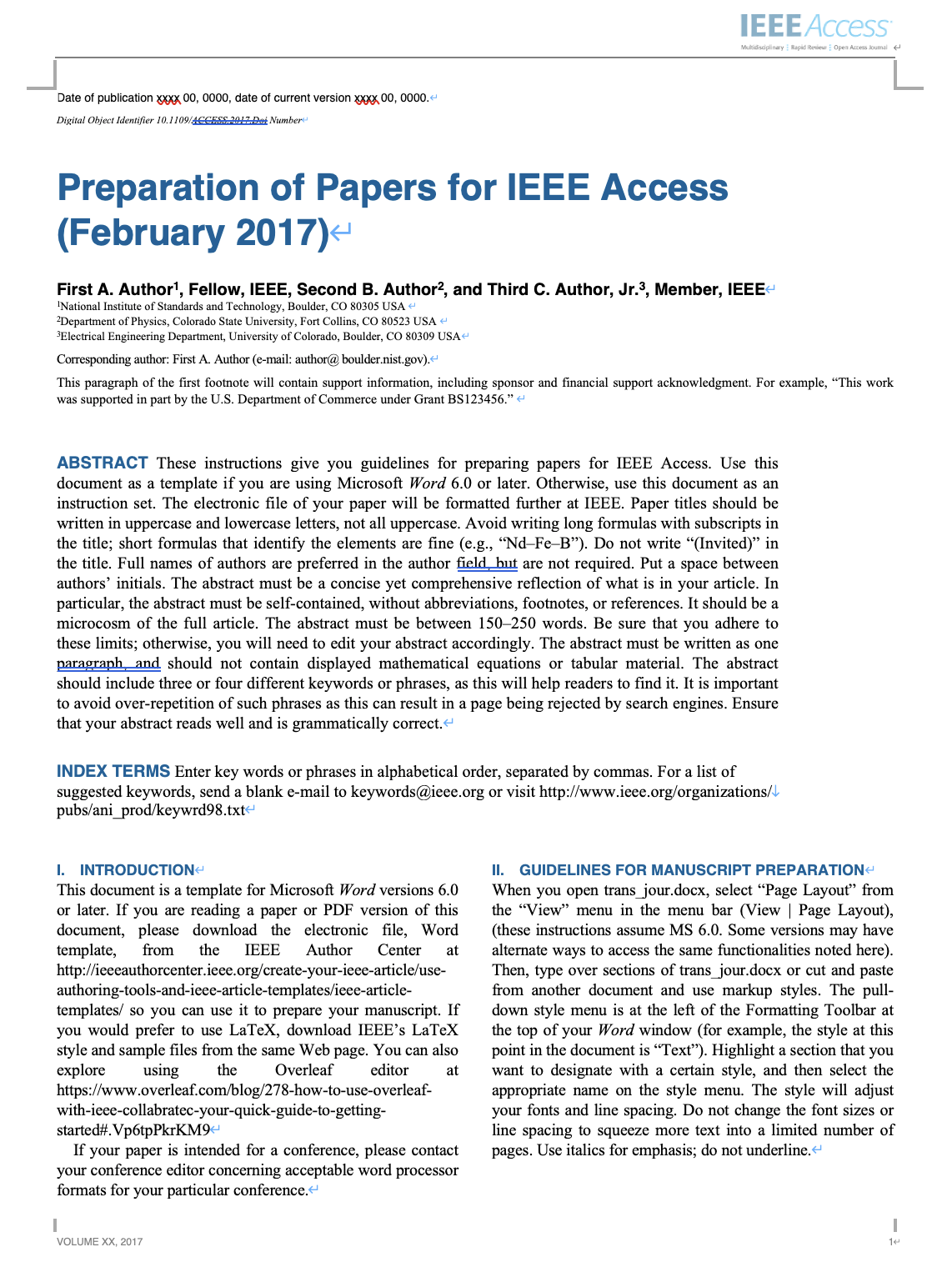IEEE Template Selector 로 이동하면 Transactions, Journals and Letters를 선택할 수 있고 거기서 IEEE Access에 대한 템플릿을 선택할 수 있게 된다. 다운로드한 템플릿 안에는 글에 대한 작성 방법과 서식들에 대해 적혀 있다. 템플릿의 내용을 그대로 따르면서 내용을 옮겨 적으면 1차적으로 완료가 된다. 그 후 3~4회 정도 정독하면서 문법적인 오류와 서식 오류를 검토하면 된다.